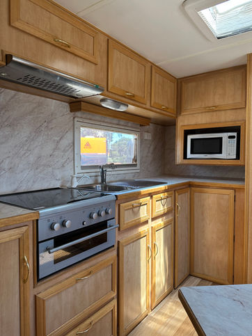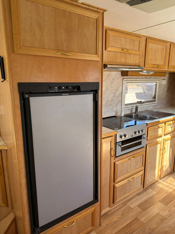 - Side kitchen - Recessed gas cooktop and grill - Rangehood -Combined shower and toilet - 3 way fridge and freezer - Stainless steel sink - Television - Air conditioner - Microwave - Rangehood